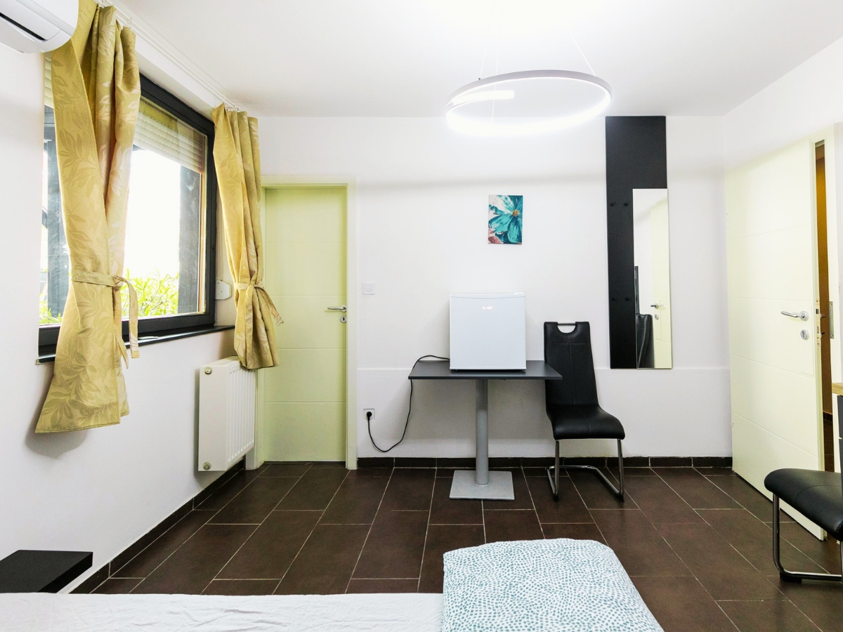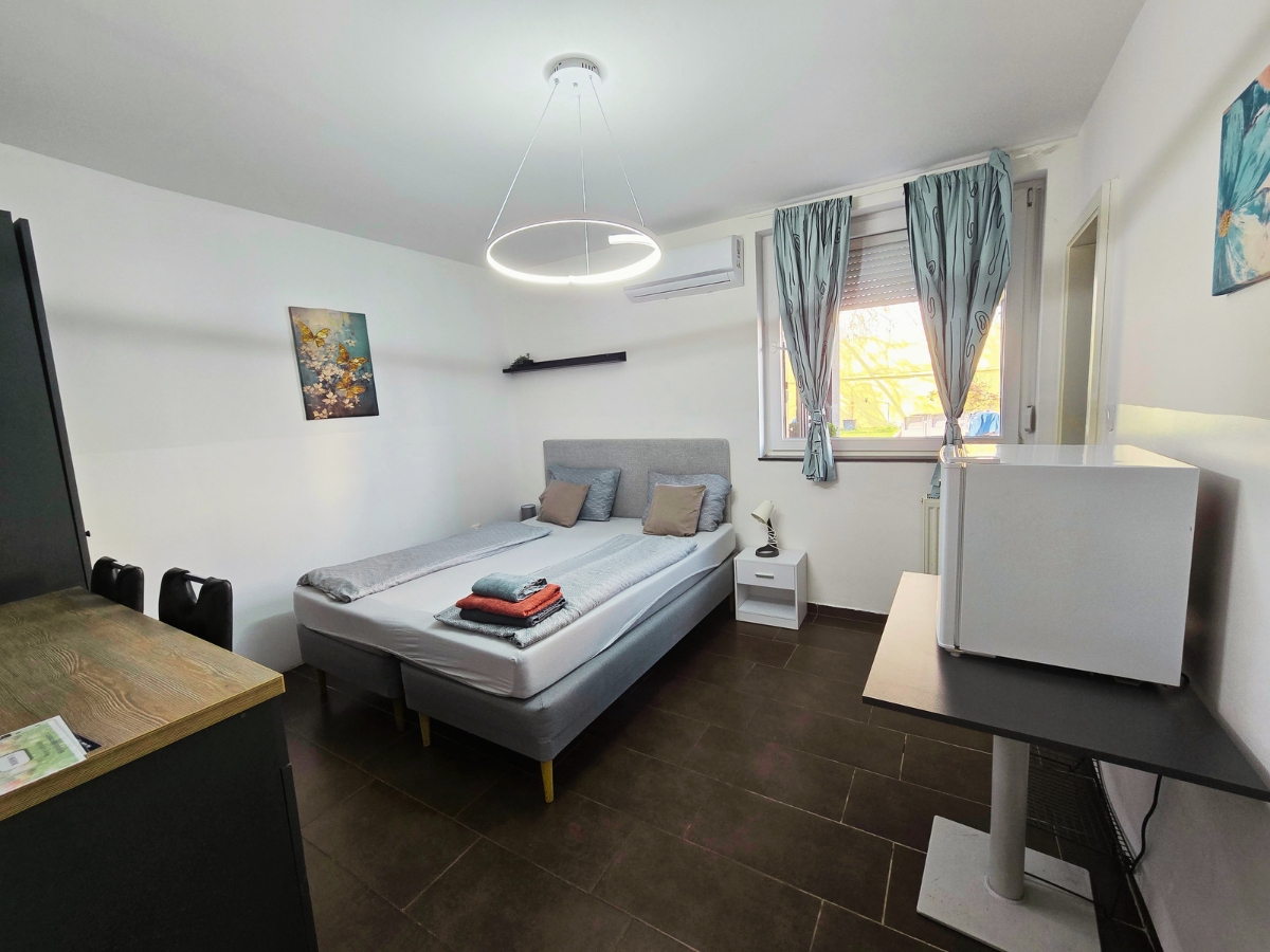 A szobĂĄban egy kĂ©nyelmes, 160Ă200 cm-es franciaĂĄgy talĂĄlhatĂł, amely legfeljebb kĂ©t felnĆtt