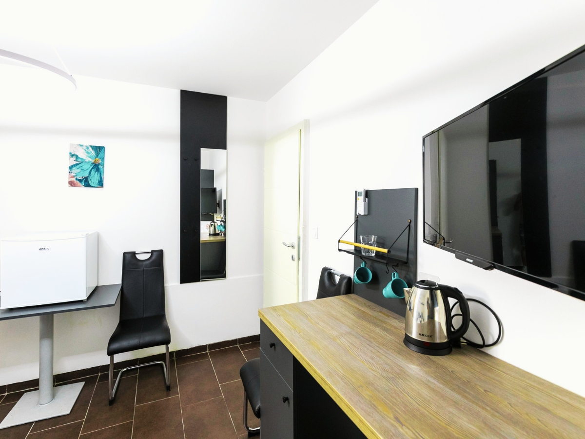 A recepciĂł közvetlen közelĂ©ben egy jĂłl felszerelt, közös hasznĂĄlatĂș konyha ĂĄll vendĂ©geink