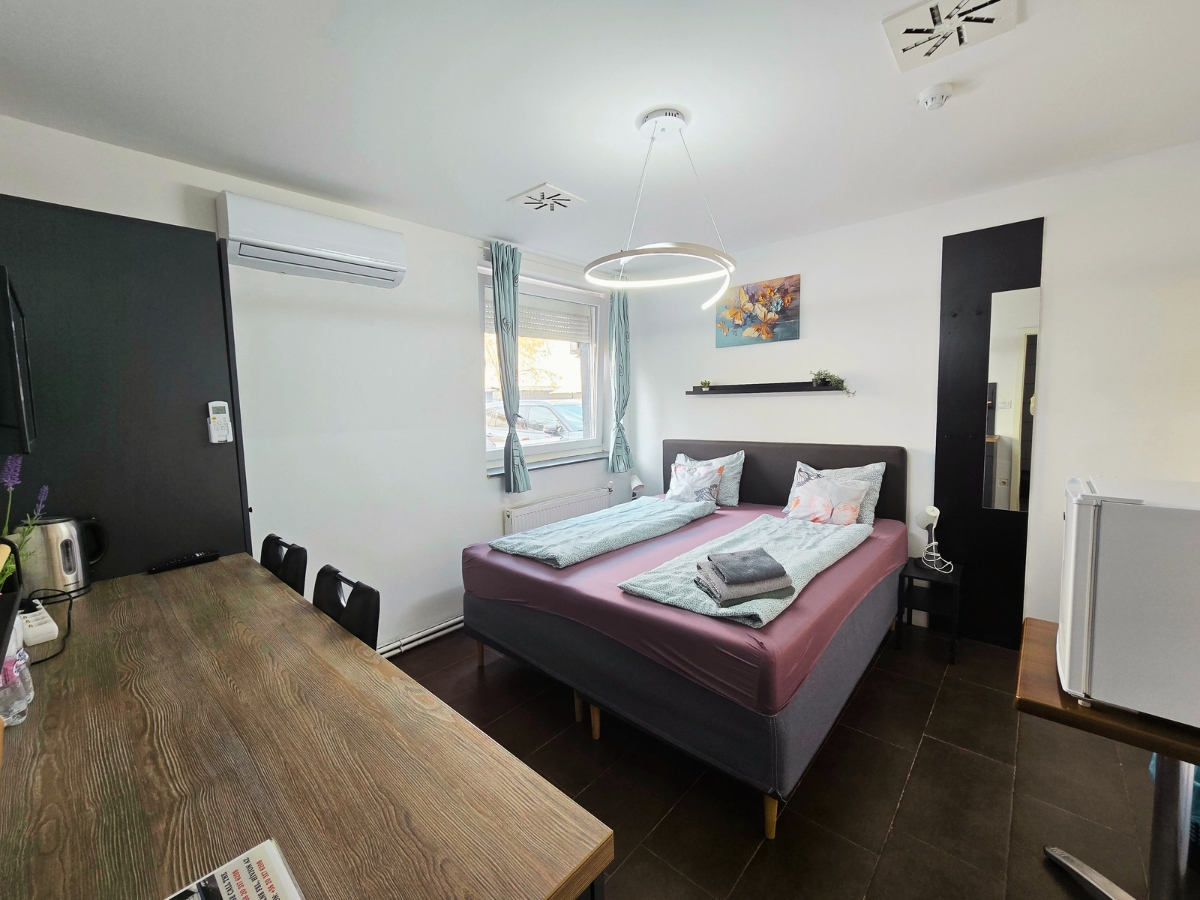 A szobĂĄban egy kĂ©nyelmes, 180Ă200 cm-es franciaĂĄgy talĂĄlhatĂł, amely legfeljebb kĂ©t felnĆtt