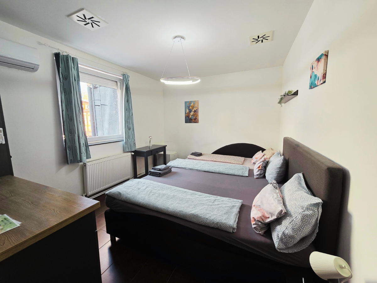 A szobĂĄban egy kĂ©nyelmes, 180Ă200 cm-es franciaĂĄgy talĂĄlhatĂł, amely legfeljebb kĂ©t felnĆtt