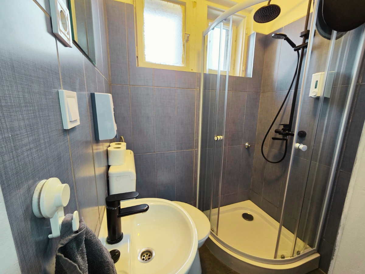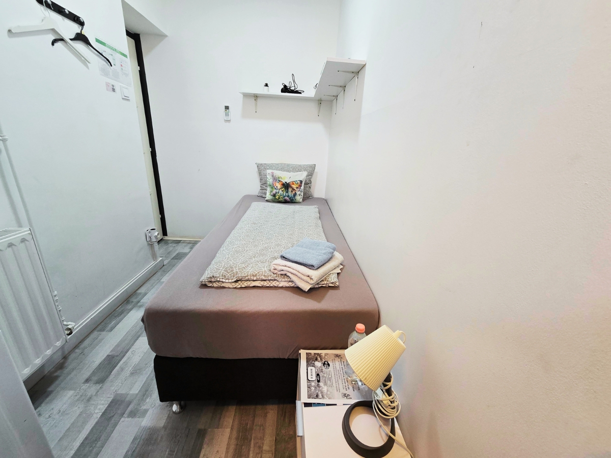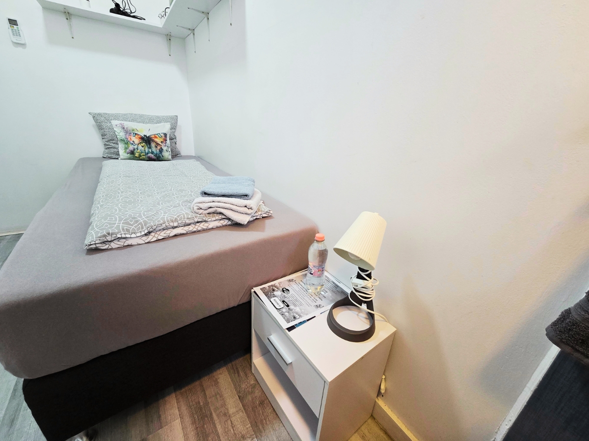 Kompakt, praktikus szoba alapfelszereltséggel, ideális rövid tartózkodásra, egy éjszakára