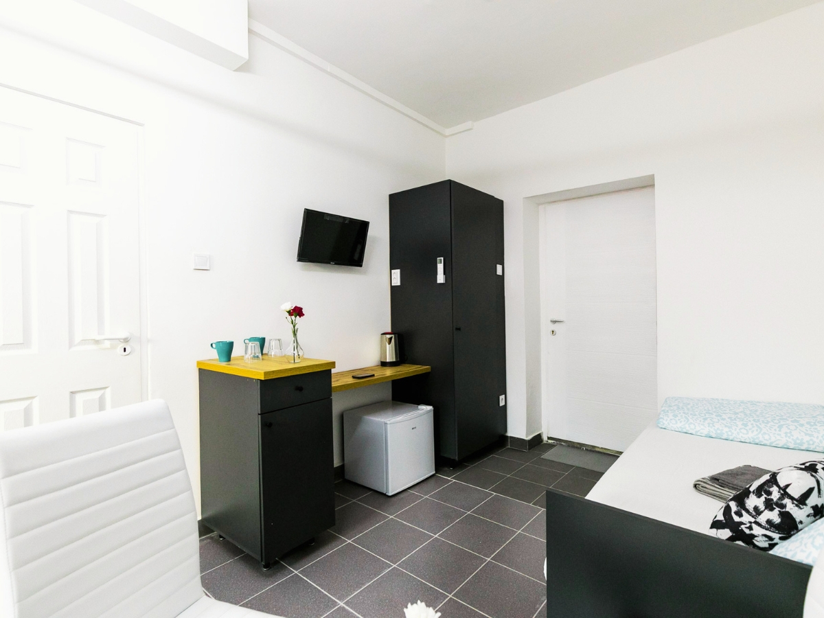 A szobĂĄban egy kĂ©nyelmes, 160Ă200 cm-es franciaĂĄgy talĂĄlhatĂł, amely legfeljebb kĂ©t felnĆtt