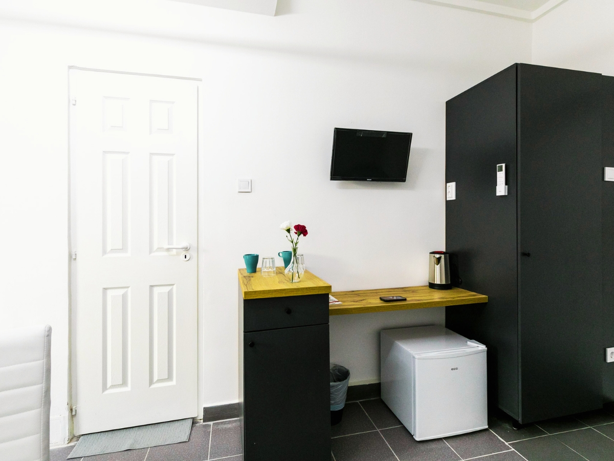 A recepciĂł közvetlen közelĂ©ben egy jĂłl felszerelt, közös hasznĂĄlatĂș konyha ĂĄll vendĂ©geink